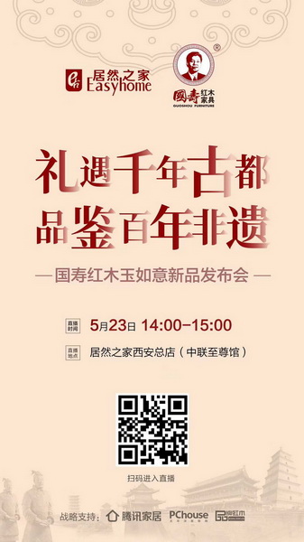 5月23日14:00,國(guó)壽紅木玉如意新品發(fā)布會(huì)將在居然之家西安總店(中聯(lián)至尊店)舉行。據(jù)悉,本次活動(dòng)由騰訊家居、太平洋家居、品牌紅木戰(zhàn)略支持,屆時(shí)可以通過騰訊直播觀看。