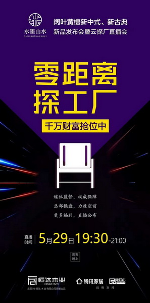 5月29日19:30-21:00,騰訊家居&品牌紅木將走進(jìn)恒達(dá)木業(yè),零距離紅木云探廠,同期還將發(fā)布“水墨山水”闊葉黃檀新中式、新古典多達(dá)100款新品。更有超值福利,等待直播公布。