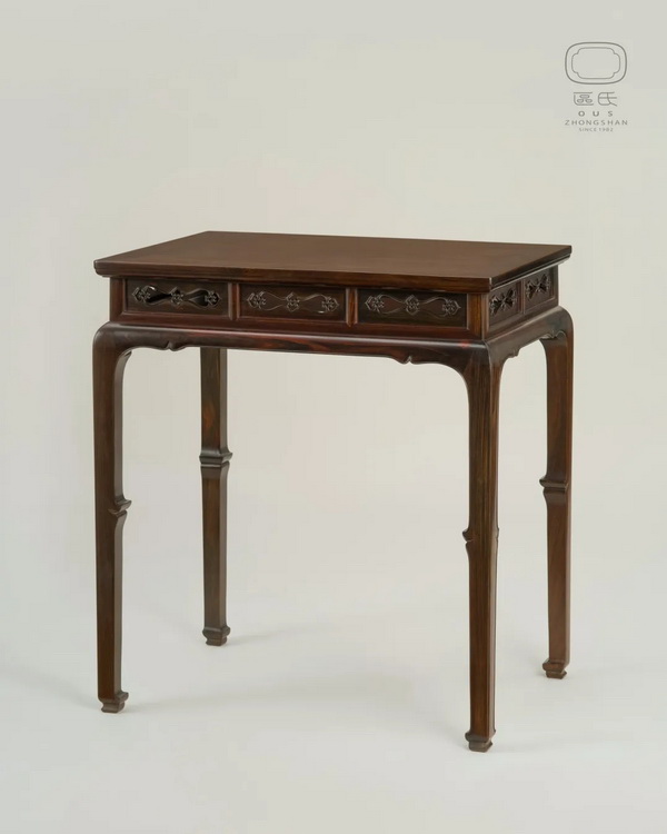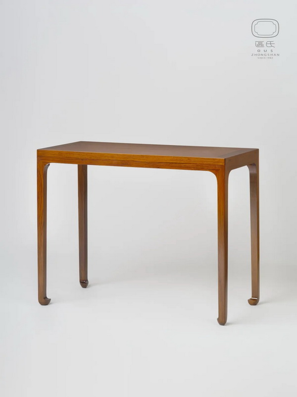 四面平式的高桌在宋代已流行,樣式極簡,雋永耐看。四面平式樣即桌子前后左右四面皆平直,無起伏。桌面芯板為整板,木紋平順?biāo)屏魉虚g花紋如漣漪,如石落潭中。腿子與牙條格角相交,先構(gòu)成一具架子,上面再和攢邊的桌面結(jié)合在一起。這樣的做法可以避免腿子和兩根邊抹三個構(gòu)件在一處相交,結(jié)構(gòu)更加堅固合理。而且,因?yàn)檫吥ê脱罈l的疊加增加了看面,視覺上不會顯得過于單薄。腿足向內(nèi)兜轉(zhuǎn)翻馬蹄,線條圓潤。馬蹄的弧線和牙板與腿子交圈形成的弧線上下應(yīng)和,沖淡外形的硬朗,視覺上在沖突中找到平衡。