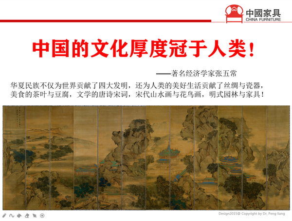 就像著名經(jīng)濟(jì)學(xué)家張五常說過的一句話:“中國的文化厚度冠于人類!”張先生認(rèn)為,未來中國對民族文化保護(hù)的市值是無法估量的。華夏民族不僅為世界貢獻(xiàn)了四大發(fā)明,還為人類的美好生活貢獻(xiàn)了絲綢與瓷器,美食的茶葉與豆腐,文學(xué)的唐詩宋詞,宋代山水畫與花鳥畫,明式園林與家具。而且從夏商周到21世紀(jì),每一個(gè)朝代都為美好生活創(chuàng)造了獨(dú)特的文化底蘊(yùn)。而今,我們在這五千年的歷程中隨機(jī)選擇幾種事物,都能將其發(fā)揚(yáng)光大。