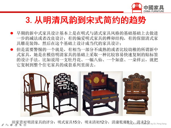三是從明清風(fēng)韻到宋式簡約的趨勢。著名明清家具專家田家青,他對明清家具的評(píng)分是,從明到清逐漸遞減。但是現(xiàn)在仍然有許多廠家把紅木家具做成“傻大笨粗”的風(fēng)格,這就是暴殄天物。