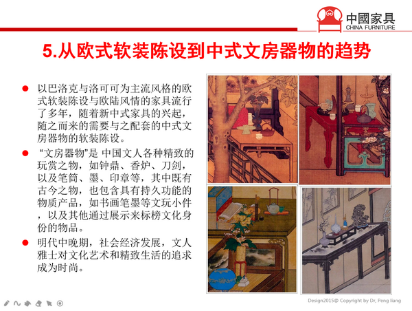 五是從歐式軟裝陳設(shè)到中式文房器物的趨勢。以巴洛克與洛可可為主流風(fēng)格的歐式軟裝陳設(shè)與歐陸風(fēng)情的家具流行了多年,隨著新中式家具的興起,隨之而來的需要與之配套的中式文房器物的軟裝陳設(shè)。