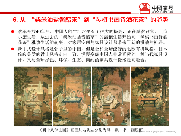 六是從 “柴米油鹽醬醋茶”到“琴棋書畫詩酒花茶”的趨勢。從過去的“柴米油鹽醬醋茶”的溫飽生活開始向“琴棋書畫詩酒花茶”雅致生活的轉(zhuǎn)變,對家居空間與家具設(shè)計(jì)都帶來了新的挑戰(zhàn)與機(jī)遇。