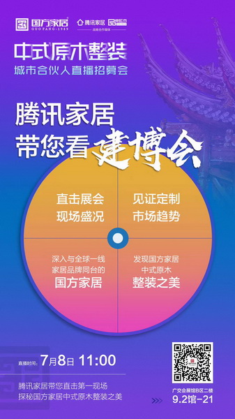 7月8日,國方家居將舉行“中式原木整裝城市合伙人直播招募會”,騰訊家居和品牌紅木作為戰(zhàn)略合作媒體。11時,騰訊家居帶您直擊建博會現(xiàn)場,在國方家居工藝美術(shù)師團隊的親自介紹下,近距離品鑒中式原木整裝之美。19時,國方家居營銷團隊還將公布超值、超優(yōu)惠的“合伙人”加盟政策,更多福利優(yōu)惠,敬請預約觀看直播。