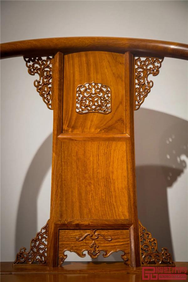 靠背板和椅圈及椅盤相交的地方使用了四塊面積較大的鏤空角牙,加強了從正面觀看的裝飾效果。