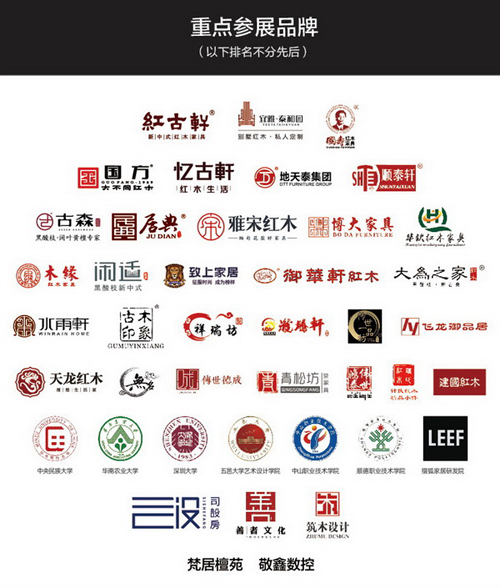 重點參展企業(yè)有:紅古軒、泰和園、國壽、國方、憶古軒、地天泰、順泰軒、古森、居典、雅宋、博大、華欽、木緣、閑適、致上、御華軒、玖月、水雨軒、古木印象、祥瑞坊、龍騰軒、傳世一品坊、飛龍御品居、天龍紅木、無名、傳世德成、青松坊、偉世鴻泰、鐘氏紅木精品小件、建國紅木、敬鑫數(shù)控、中央民族大學、華南農(nóng)業(yè)大學、深圳大學、五邑大學、中山職業(yè)技術(shù)學院、順德職業(yè)技術(shù)學院、獵狐家居研發(fā)院、司設(shè)房、善者文化、筑木設(shè)計、梵居檀苑等。