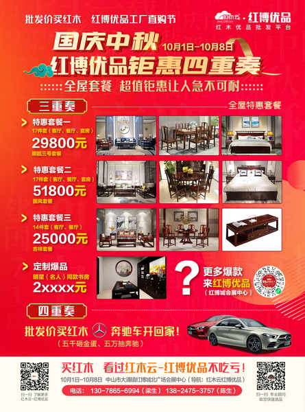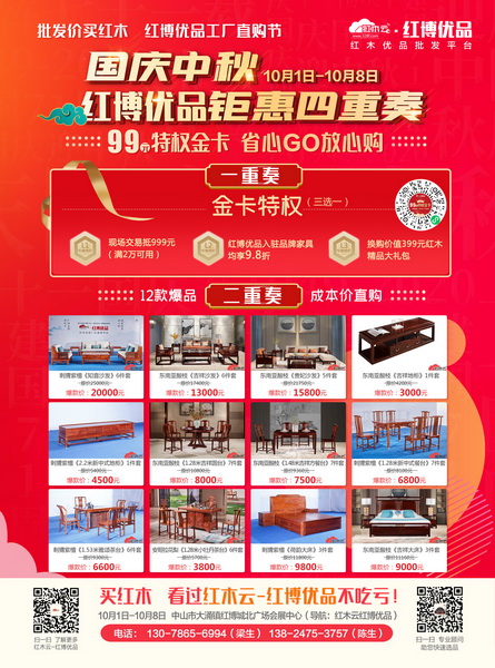 [摘要]10月1日——10月8日,廣東中山大涌紅博城北廣場會展中心,“批發(fā)價買紅木,紅博優(yōu)品工廠直購節(jié)”將為你開啟美好生活雙節(jié)“十”惠!“99元特權(quán)金卡”領(lǐng)跑優(yōu)惠豪禮四重奏,批發(fā)價碰上奔馳和紅包,坐實全年超值!
