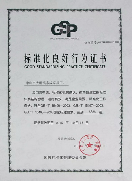 2009年,公司通過了二級計(jì)量標(biāo)準(zhǔn)體系認(rèn)證。強(qiáng)化了企業(yè)在測量管理體系方面的監(jiān)督和管理,讓公司在質(zhì)量管理、成本管理、節(jié)能降耗、提升效益等方面上升了一個(gè)臺階。2012年,東成紅木成為廣東省紅木家具行業(yè)首家“4A級標(biāo)準(zhǔn)化良好行為企業(yè)”,在生產(chǎn)、經(jīng)營等各環(huán)節(jié)全面實(shí)行標(biāo)準(zhǔn)化管理,且取得良好的經(jīng)濟(jì)效益和社會效益。2015年,東成紅木以高分成績順利通過復(fù)審,被繼續(xù)認(rèn)定為4A級標(biāo)準(zhǔn)化良好行為企業(yè)。2013年起,東成紅木接連參與制/修訂了國標(biāo)《紅木》、行標(biāo)《深色名貴硬木》等多項(xiàng)標(biāo)準(zhǔn),2018年9月又主動(dòng)承擔(dān)《中式硬木工藝家具商品標(biāo)價(jià)簽編制規(guī)范》團(tuán)標(biāo)標(biāo)準(zhǔn)制定第一起草單位重任,東成紅木一直行走在標(biāo)準(zhǔn)化建設(shè)工作的道路上。
