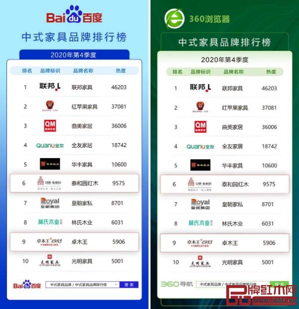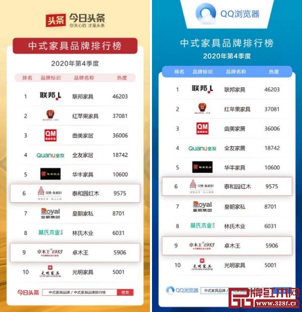 近日,泰和園、卓木王代表紅木品牌與聯(lián)邦家具、曲美家居、全友家居等品牌比肩上榜百度、360瀏覽器、今日頭條、QQ瀏覽器中式家具品牌排行榜TOP10,樹立紅木業(yè)界典范,展現(xiàn)中國紅木品牌魅力與活力。