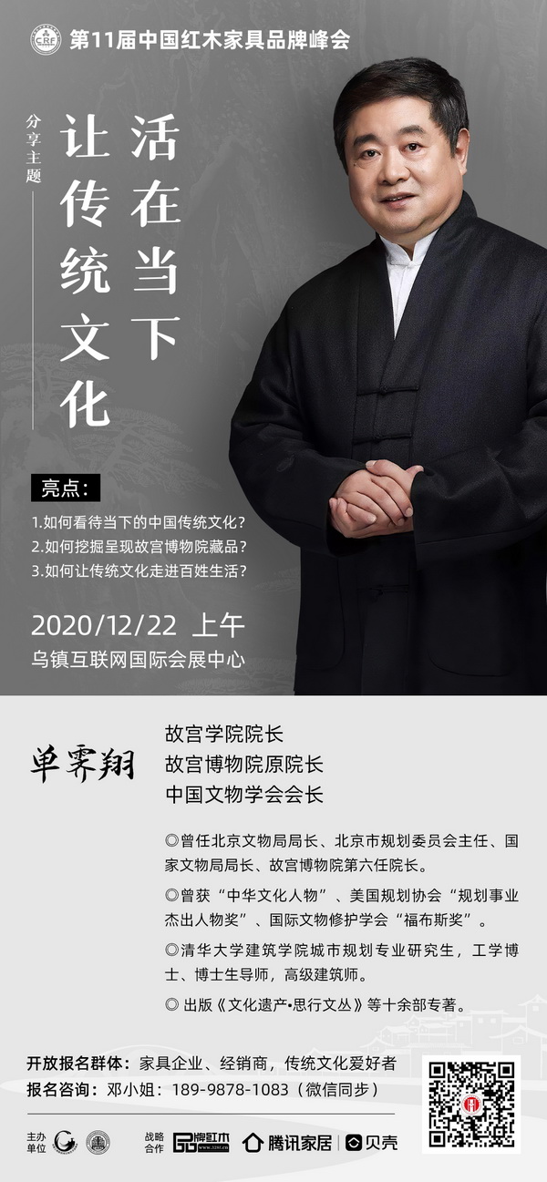 12月22日,故宮學院院長、故宮博物院原院長、中國文物學會會長單霽翔將出席第11屆中國紅木家具品牌峰會,帶來《讓傳統(tǒng)文化活在當下》主題分享,在世界互聯(lián)網(wǎng)大會舉辦地浙江烏鎮(zhèn),賦能紅木家具行業(yè)創(chuàng)新發(fā)展。