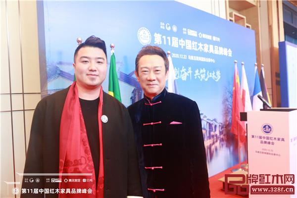 河北大家風范紅木樓總經(jīng)理陳振與中央電視臺主持人趙保樂在峰會現(xiàn)場合影留念