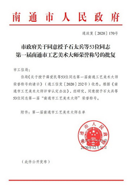 多年對匠心的堅守,今朝駿業(yè)日新。據(jù)了解,此次工藝大師的評定,由南通市人民政府主導,評定過程非常嚴格,評委庫成員主要由中國工藝美術大師、江蘇省工藝美術大師、研究員級高級工藝美術師等組成。最終入選的大師將由南通市人民政府授予榮譽稱號,并頒發(fā)證書。叢東云能獲得“南通市工藝美術大師”榮譽稱號,實至名歸,也意味著一份新的責任與使命。