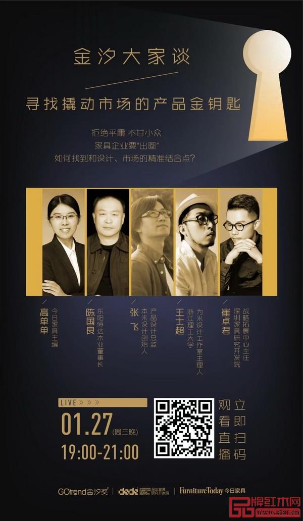 1月27日,恒達木業(yè)董事長陳國良、浙江理工大學(xué)為來設(shè)計工作室主理人/導(dǎo)師王士超,以及本來設(shè)計創(chuàng)始人張飛,將參與由今日家具與金汐獎共同主辦的線上論壇——金汐大家談:尋找撬動市場的產(chǎn)品金鑰匙。