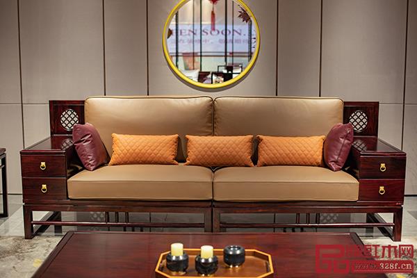 雍博堂春風(fēng)新中式《上善若水沙發(fā)》以“中式文化”、“舒適生活”為理念,由名貴優(yōu)質(zhì)非洲酸枝木打造。在整體舒適性上,巧妙地運用高回彈填充材料與真皮沙發(fā)坐墊相結(jié)合,以緩解坐姿疲勞;在實用性上,以三十五厘米的扶手位打造充足的儲物空間;在結(jié)構(gòu)上,以傳統(tǒng)榫卯工藝為基準,保證穩(wěn)定性;在設(shè)計上,十分注重細節(jié),沙發(fā)靠背通過鏤空,以透雕形式呈現(xiàn)了一對圓形水波紋圖案,意在通過自然中水面的澄清,使人感覺到放松,以達到靜心凝神的作用。