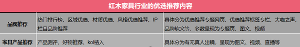 ·紅木家具行業(yè)的優(yōu)選推薦內(nèi)容,主要分為品牌推薦、家具產(chǎn)品推薦。品牌推薦形式主要包括:熱門排行榜、區(qū)域優(yōu)選、材質(zhì)優(yōu)選、風(fēng)格優(yōu)選推薦、IP欄目品牌推薦,具體分為優(yōu)選推薦專題網(wǎng)頁、優(yōu)選推薦標(biāo)簽專欄、大咖之聲、品牌軟文等,多數(shù)呈現(xiàn)為專題頁、圖文、視頻 。家具產(chǎn)品推薦形式主要包括:產(chǎn)品測評、好物推薦、kol植入,具體分為有無真人出鏡,呈現(xiàn)為圖文、視頻、直播等。