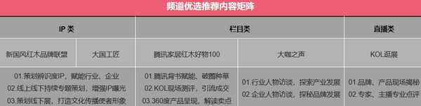 ·騰訊家居紅木頻道2019年成立上線,定位紅木家具行業(yè)走進(jìn)“大家居”、走向消費(fèi)者的背書和流量平臺,打造了IP類、欄目類、直播類等品牌和產(chǎn)品優(yōu)選推薦內(nèi)容,包括新國風(fēng)紅木品牌聯(lián)盟、騰訊家居紅木好物100、大咖之聲等,合作品牌穩(wěn)定增加,頻道影響力快速積累,帶動企業(yè)宣傳勢能增加。
