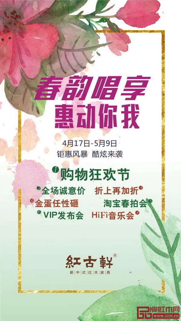 4月17日-5月9日,紅古軒將舉辦“春韻唱享 惠動(dòng)你我”大型購物狂歡節(jié),全場誠意價(jià)、金蛋任性砸。在5月1日,將攜手低音歌唱家趙鵬以及女中音歌手郭宴,透過音樂感受中式文化魅力。同期,紅古軒“老友記”鉆石會(huì)員俱樂部也將隆重發(fā)布。5月2日下午2點(diǎn),紅古軒紅木臻品春季拍賣會(huì)將準(zhǔn)時(shí)開拍,十余件產(chǎn)品0元起拍!