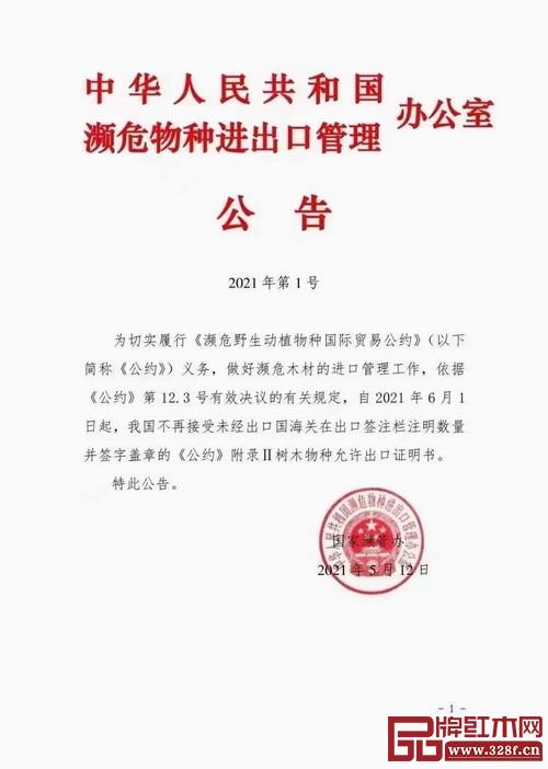 5月12日,中華人民共和國瀕危物種進出口管理辦公室發(fā)布2021年第1號公告,自2021年6月1日起,我國不再接受未經(jīng)出口國海關(guān)在出口簽注欄注明數(shù)量并簽字蓋章的《瀕危野生動植物種國際貿(mào)易公約》(CITES)附錄Ⅱ樹木物種允許出口證明書。此公告一出,再次引起紅木業(yè)界的關(guān)注和熱議。