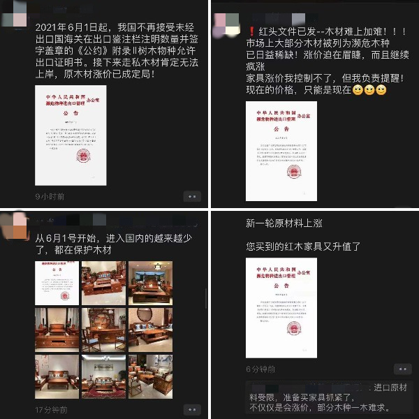 需要重視的是,自去年疫情大爆發(fā),全球木材短缺問題便日益嚴重,紅木的國際貿(mào)易也進一步收縮規(guī)模。與此同時,紅木產(chǎn)地資源不斷減少乃至枯竭,也為紅木原材漲價而導(dǎo)致的家具產(chǎn)品漲價埋下了伏筆。