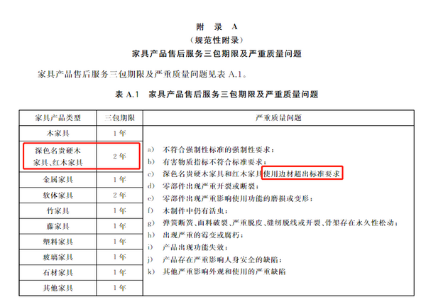 (2)銷售方應(yīng)明確售后三包方式及期限,三包期限不應(yīng)低于附錄A的規(guī)定。深色名貴硬木家具和紅木家具三包期限為兩年以上。