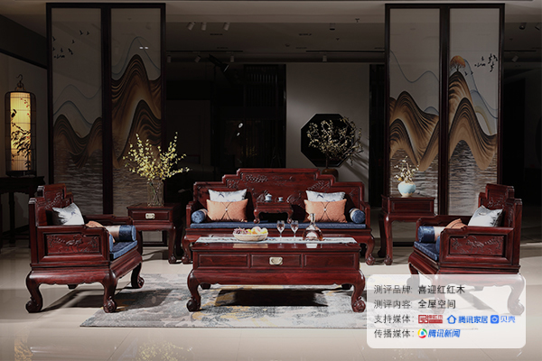 喜迎紅紅木堅持“守藝傳心 喜迎美居”。走進美好家居,迎面而來最亮眼的空間,非客廳莫屬。