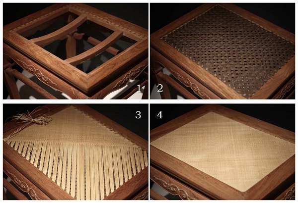 藤面的做法除了常見的棕繃穿藤以外,還有一種是木板做底,不繃棕繩,直接穿藤的做法,藤面和木板有一定間隙。