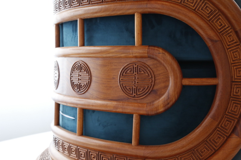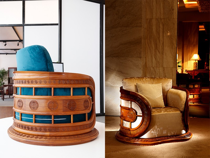裝飾手法上,《風(fēng)云椅》是新中式的特色,以簡代繁。側(cè)面局部裝飾有回形紋、團(tuán)壽紋,是綿延流長的吉祥含義。