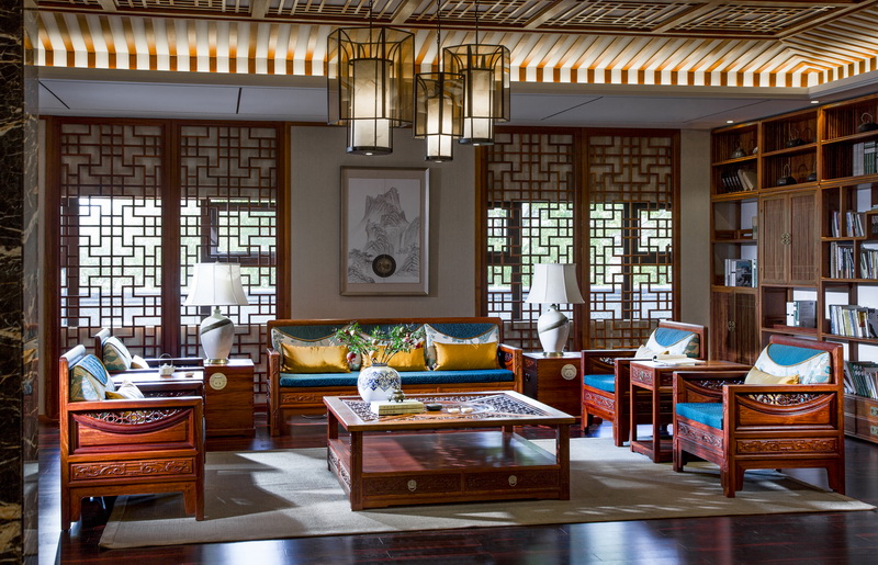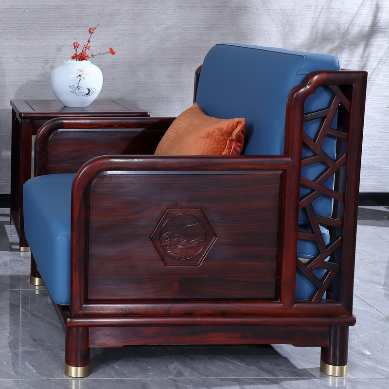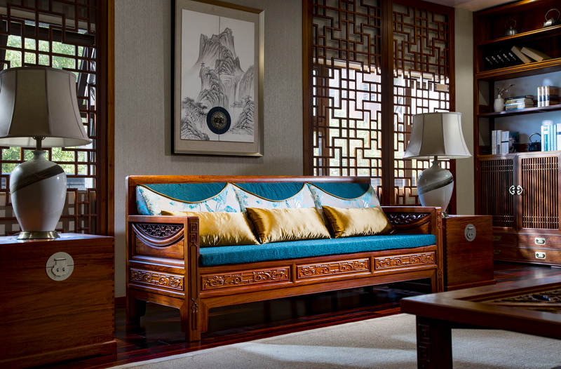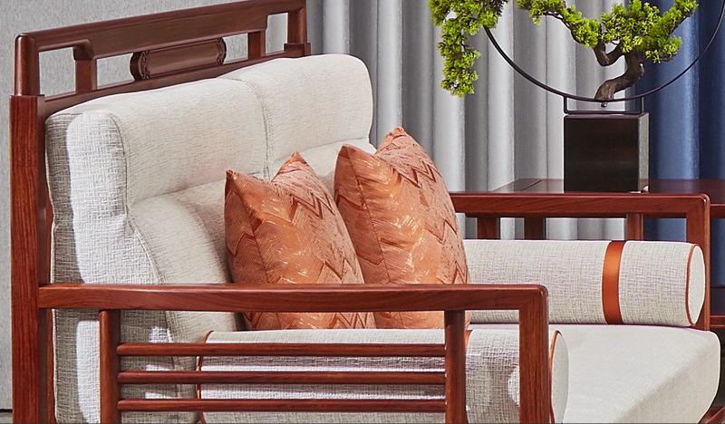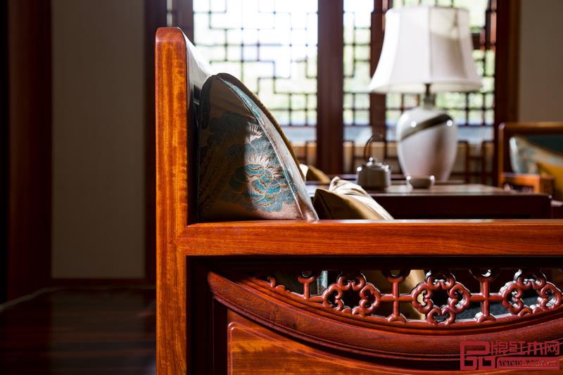 沙發(fā)側(cè)面設(shè)計,像園林里面那種窗格的花紋,很有庭院的情調(diào)。扶手面板,還雕刻了一幅簡約山水畫面,充滿詩情畫意。