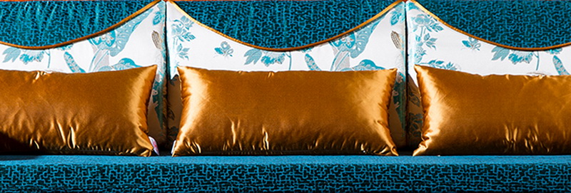 沙發(fā)的軟裝也很特別,深藍(lán)色部分是一種無規(guī)則的、比較現(xiàn)代的紋理,淺色部分是花草和蝴蝶,清新浪漫。金色的腰枕讓靠背更加貼合,更加舒服。
