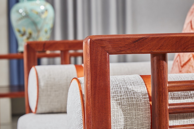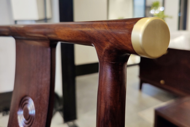 這款沙發(fā)同樣選材緬甸花梨,緬甸花梨學(xué)名大果紫檀,它是紅木里的“大眾情人”,香氣特別有辨識度。緬甸花梨的木紋非常漂亮,從茶幾面板的紋理就可以看出是非常順直和清晰的。