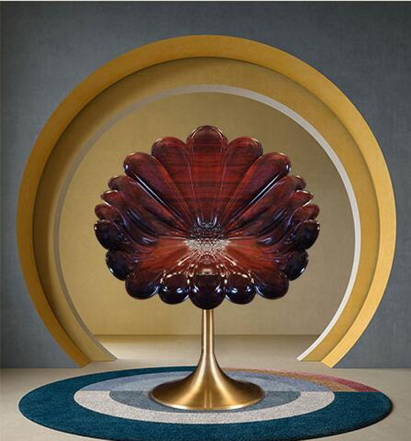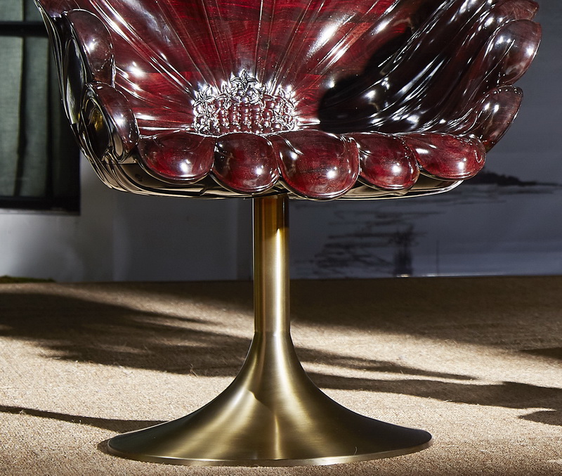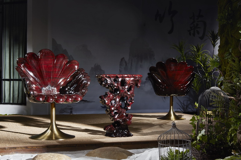 這對非常浪漫的椅子,適合豪情浪漫的朋友。金屬的腿就是花的枝干,座位是野菊花造型。小葉紫檀材質(zhì)和金屬結(jié)合,奇巧有趣。