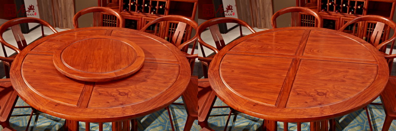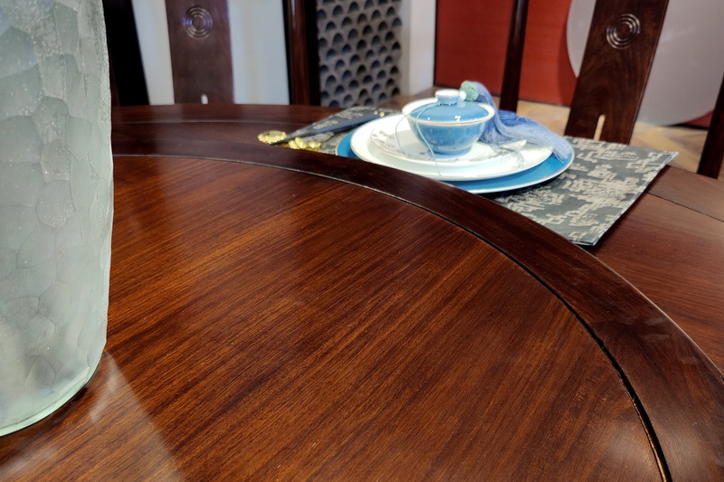 刺猬紫檀呈現(xiàn)沉穩(wěn)溫馨的栗子色,木紋也非常清晰優(yōu)美。圓桌有1.38米和1.58米兩個尺寸,帶托盤,家里人多或者請客時,有圓盤會比較方便,不會讓人飛象過河那么尷尬。