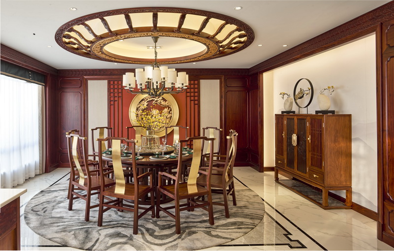 卓木王專門做中式整裝,除了家具,整個餐廳場景,像背后的護(hù)墻板、天花的圓形裝飾等等,都可以復(fù)制到家里。當(dāng)然,也可以量身定做。