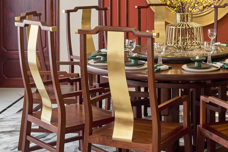 它整體是當(dāng)代中式風(fēng)格,款式上是以少勝多、以簡勝繁的感覺。同時也顯得很圓潤柔和,有東方圓融的這種哲學(xué)文化氣息。桌子支柱是六面實(shí)面板圍合。椅子上面點(diǎn)綴金屬包邊,亮色一下子把深沉的感覺打破。