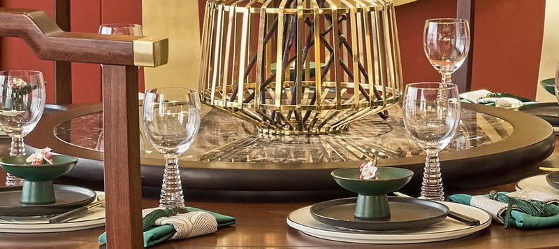 這個“醉中國”系列餐廳,也是紅木和金屬結(jié)合,但它金屬的比例不一樣,整個椅背都用金屬來做,而且弧線優(yōu)美,感覺更加精致、現(xiàn)代時尚。托盤設(shè)計,木框中間鑲了石材,輕奢、現(xiàn)代。