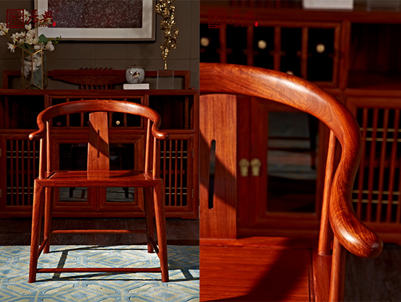整個椅子的木框用的是緬甸花梨材質(zhì),造型都是“圓”和“弧”的感覺,和以往方正的紅木家具有很大不同。