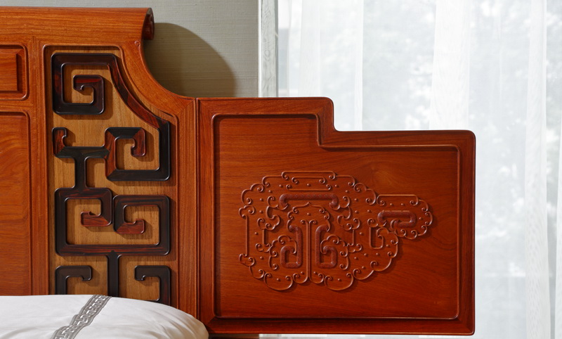 玉如意大床的床頭像古代建筑的屋檐,還有卷書的造型。深色拐子紋由大紅酸枝拼接,寓意子孫延綿。