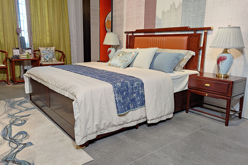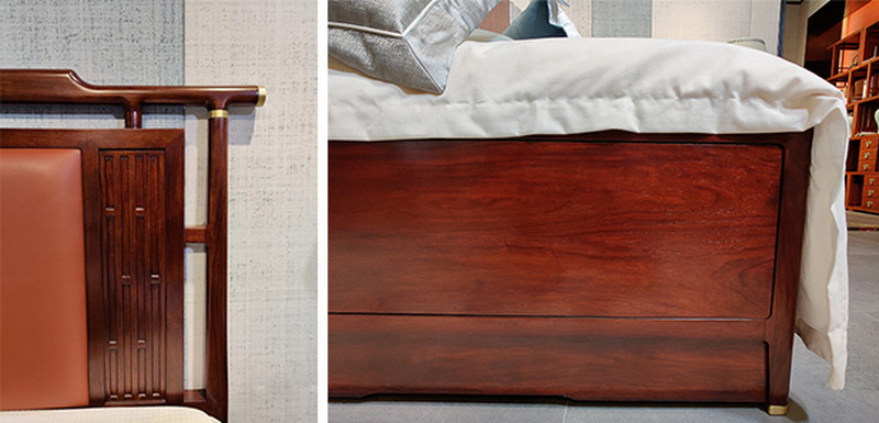 刺猬紫檀的大床,中間是愛馬仕橙的軟包靠背,整體設(shè)計簡潔,追求舒適。靠背板的設(shè)計細(xì)節(jié)簡約時尚。床體是密實(shí)的面板,離地有一定空間,四腳承重。
