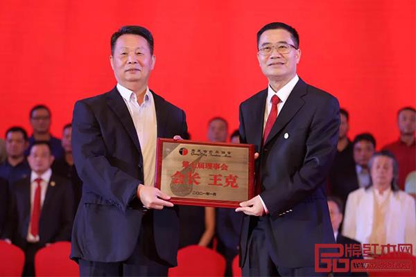 廣東省社會組織管理局副局長徐祖平(左)為廣東省家具協(xié)會第七屆理事會會長王克頒牌