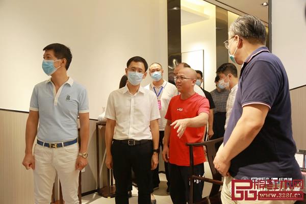 開幕式后,中山市大涌鎮(zhèn)黨委副書記、鎮(zhèn)長(zhǎng)李家豪,全聯(lián)藝術(shù)紅木家具專業(yè)委員會(huì)專家顧問曹新民、李凱夫以及紅木界專家領(lǐng)導(dǎo)組成的貴賓參觀團(tuán)一行來到印巷茶舍四樓新展廳,品鑒印巷茶舍國(guó)潮新中式茶家具產(chǎn)品。