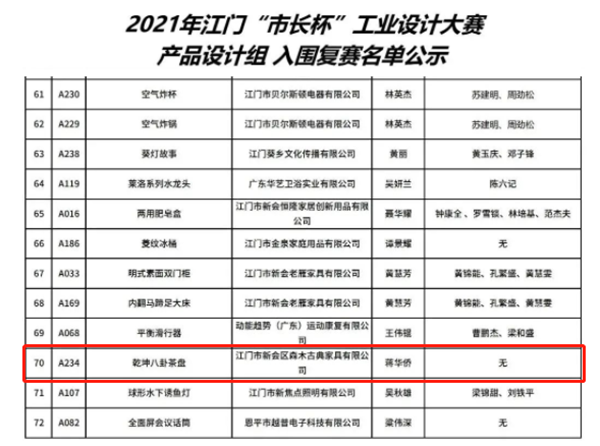 2021年9月25日,江門“市長杯”工業(yè)設(shè)計(jì)大賽開展初賽評審活動,經(jīng)專家評委反復(fù)研究,多輪投票,最終從2115件作品中評選出278件作品進(jìn)入復(fù)賽階段,其中概念設(shè)計(jì)組172份,產(chǎn)品設(shè)計(jì)組106份,江門市新會區(qū)森木古典家具有限公司(以下簡稱森木家具)創(chuàng)新設(shè)計(jì)產(chǎn)品《乾坤八卦茶盤》入圍復(fù)賽。