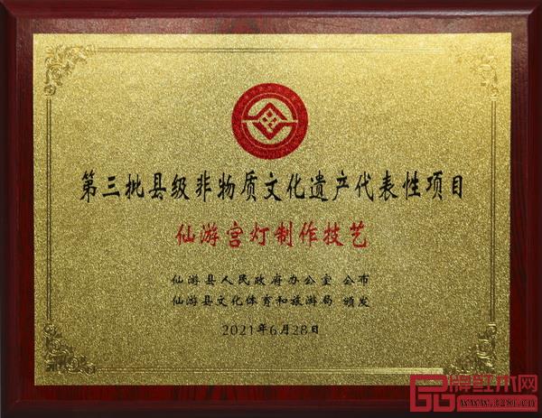2021年6月,第三批仙作非物質(zhì)文化遺產(chǎn)代表性項(xiàng)目 仙游宮燈制作技藝傳承單位。