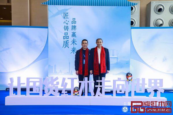 天勤紅木董事長(zhǎng)周?chē)?guó)航(左)受邀出席第12屆中國(guó)紅木家具品牌峰會(huì),并與故宮博物院文保科技部原主任曹靜樓合影