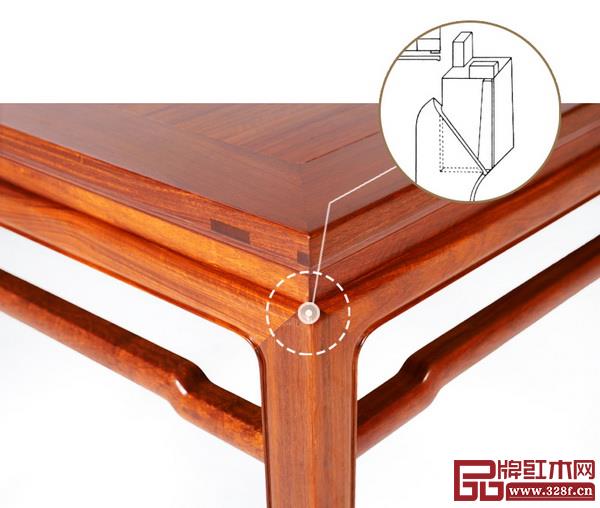 桌面以格角榫攢邊鑲面芯板,冰盤沿打漥出透榫,桌腿與兩側(cè)牙板以棕角榫連接……整桌全部采用傳統(tǒng)標(biāo)準(zhǔn)榫卯結(jié)構(gòu),沒(méi)有一顆鐵釘?shù)冉饘龠B接件。有些廠家會(huì)偷偷在家具內(nèi)部使用鐵釘或者假榫卯,從外表看不出,但桌子的堅(jiān)實(shí)度會(huì)大打折扣。
