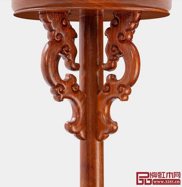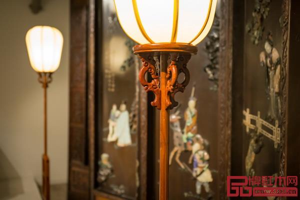 燈架底部采用屏座式的造型,左右雕卷草紋墩木上植立柱,前后站牙抵夾,其下安披水牙子,確保燈架站立穩(wěn)固。