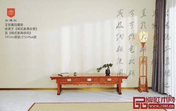 案子通長2米10,案面攢框鑲獨(dú)板,紋理優(yōu)美,一氣呵成,宛若一幅天然的山水畫。