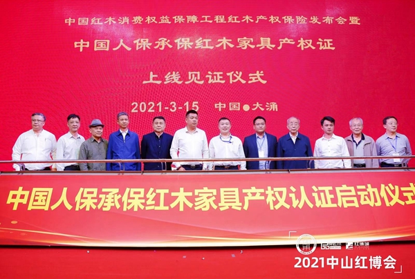 中國人保承保紅木家具產(chǎn)權(quán)認(rèn)證上線,居典紅木董事長尹付林(左六)出席了啟動儀式