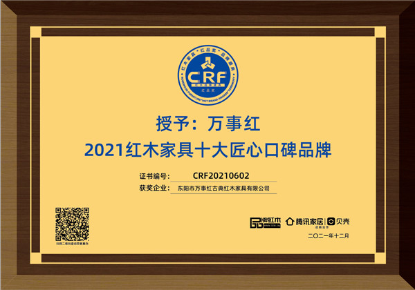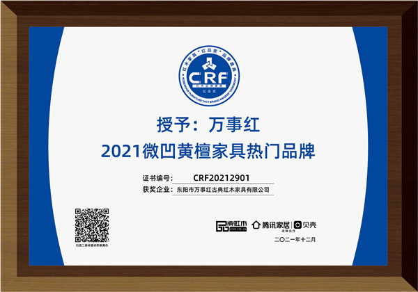 作為一家專業(yè)制作微凹黃檀家具的紅木家具企業(yè),萬事紅紅木在近日舉辦的第12屆中國紅木家具品牌峰會中獲得“2021紅木家具十大匠心口碑品牌”和“2021微凹黃檀家具熱門品牌”兩項大獎,董事長蔣國洪被評為“2021紅木家具十大風云企業(yè)家”,這三項大獎是萬事紅品牌不斷騰飛的重要見證。