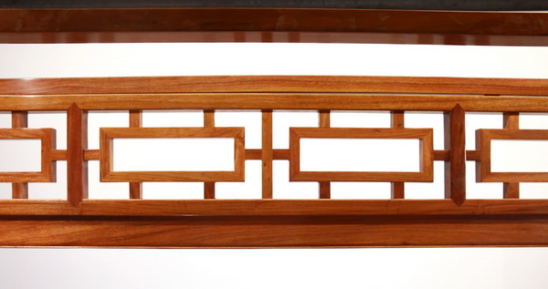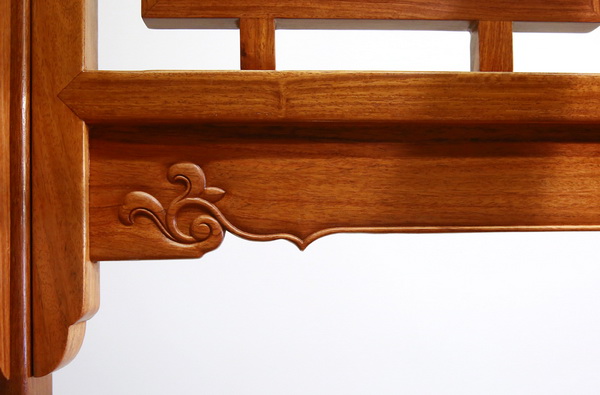 此床尺寸寬大,四面有工,每個角度皆可觀可賞,在寬大的臥室陳設,實用又氣派。紅橋紅采用緬甸花梨制作,選材、用料和做工都值得稱道。