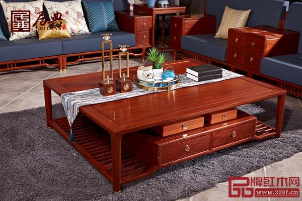 居典紅木《圓融茶臺》茶臺面采用花瓣式的設計,如坐花中品茶